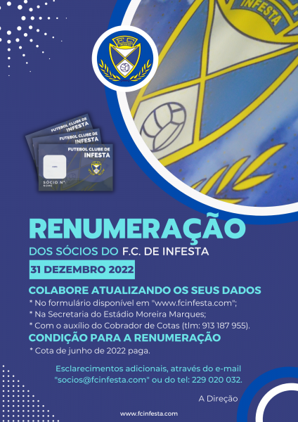 A Direção do F. C. de Infesta informa que irá levar a efeito, até ao final do ano em curso, a renumeração dos seus Sócios, dando cumprimento ao que se encontra preceituado no artigo 16º dos Estatutos do Clube.